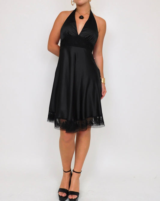 Y2K Black Satin Halter Dress | Size S